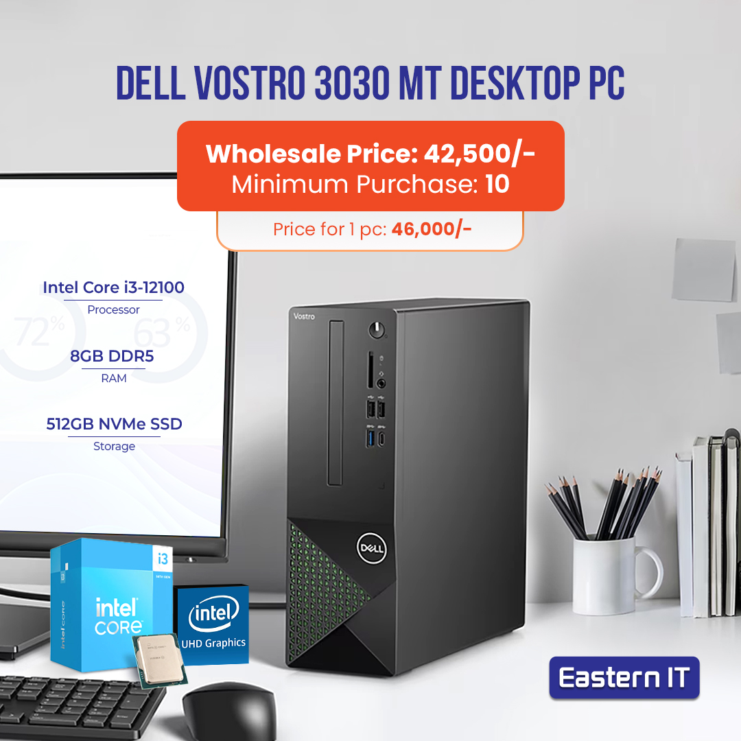 Get the Dell Vostro Intel 3030 MT Core i3 12100 8GB DDR5 512GB SSD Brand PC at the best price in Bangladesh. Check latest price in BD is 46,000.00.