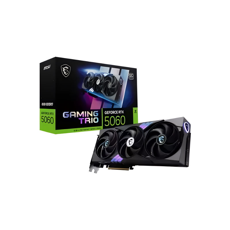 The MSI GeForce RTX 5060 8G GAMING TRIO OC is a mid-range graphics card designed for 1080p and 1440p gaming. It features 8GB of GDDR7 memory, 3,840 CUDA cores, and a boost clock up to 2,640 MHz. Based on NVIDIA's Blackwell architecture, it supports DLSS 4, ray tracing, and PCIe 5.0. The card utilizes the TRI FROZR 4 thermal design for efficient cooling and offers three DisplayPort 2.1b and one HDMI 2.1b outputs. With a 128-bit memory interface and PCIe Gen 5 x16 interface, it delivers a balance of performance and compatibility for gamers.